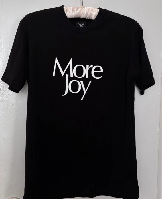 I get to the restaurant and Emily is at a booth. I can’t see what the white letters on her black t-shirt say until she stands to greet me.