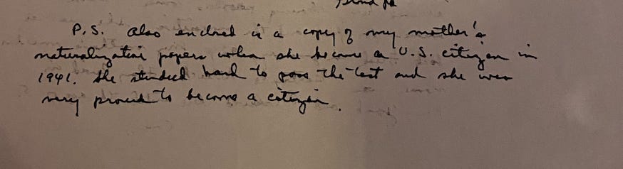 “She studied hard to pass the test.” My grandmother had a 6th-grade education. Her English wasn’t great, but she was smart and hard-working. I smile at “she was very proud to become a citizen.”