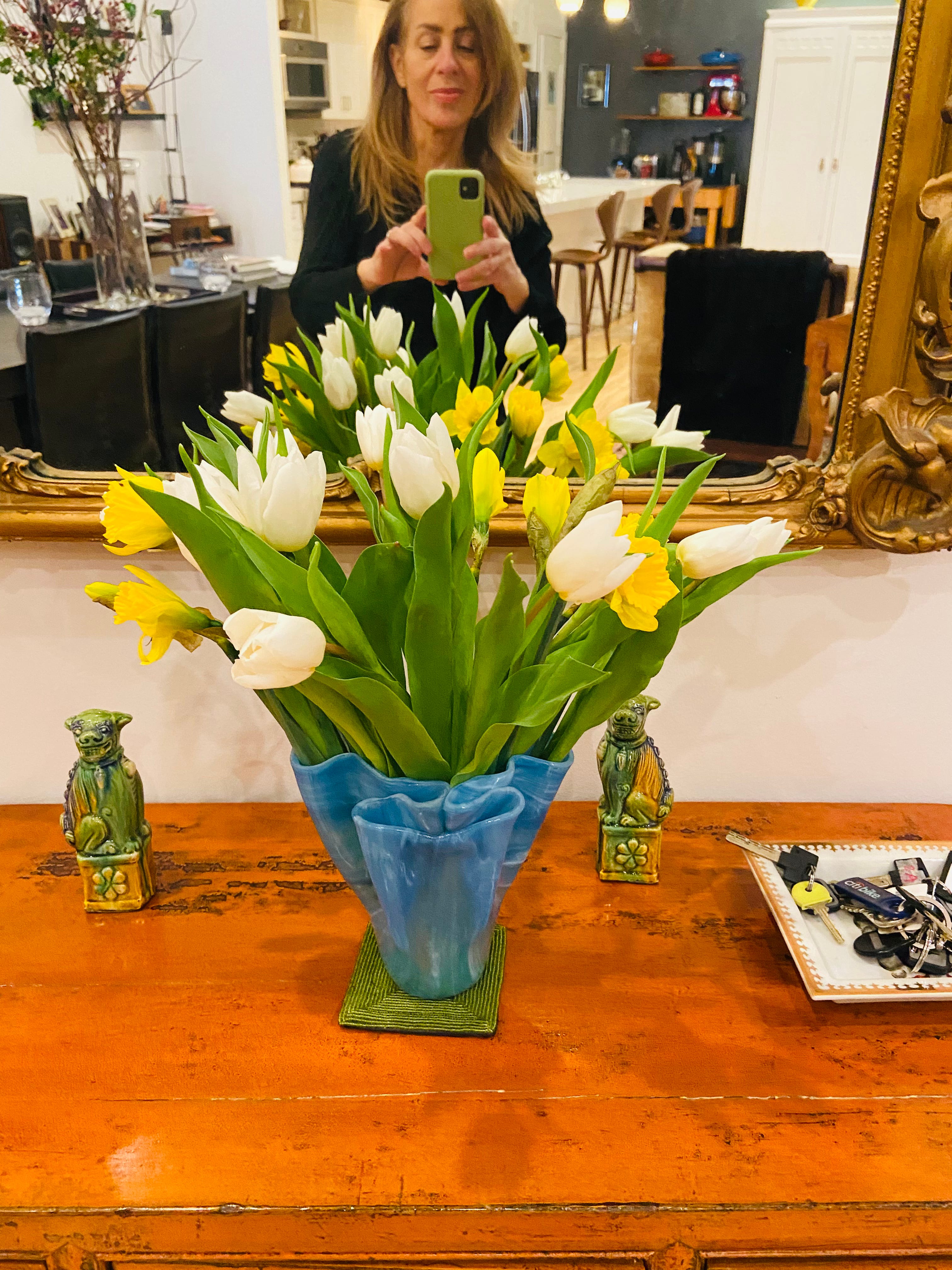 I stop at a bodega and buy tulips and daffodils, and when I get home, put them into a vase that F made. I don’t realize I’m in the picture until after I take it.